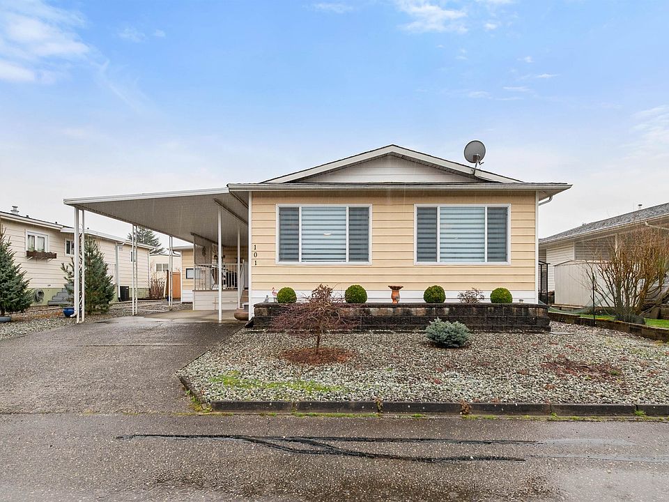 Bright, Clean Immaculately cared for home in Rainbow Estates. Light pours in this spacious open floor plan with a lovely dining area, a kitchen you will enjoy with ample cabinets & counters great for prep/baking. Family room has sliding doors opening onto 16x11 covered deck, private patio in back yard. 2 bedrooms, primary bedroom features large inviting ensuite with soaker tub. New windows, flooring, plumbing & paint. 2 storage rooms, new fencing in back yard. Parking for 3 & conveniently located across from Clubhouse. Complex offers RV parking, walking distance to hockey games & entertainment. Age 40+, 2 small pets allowed, no rentals.