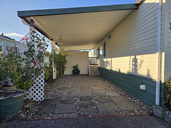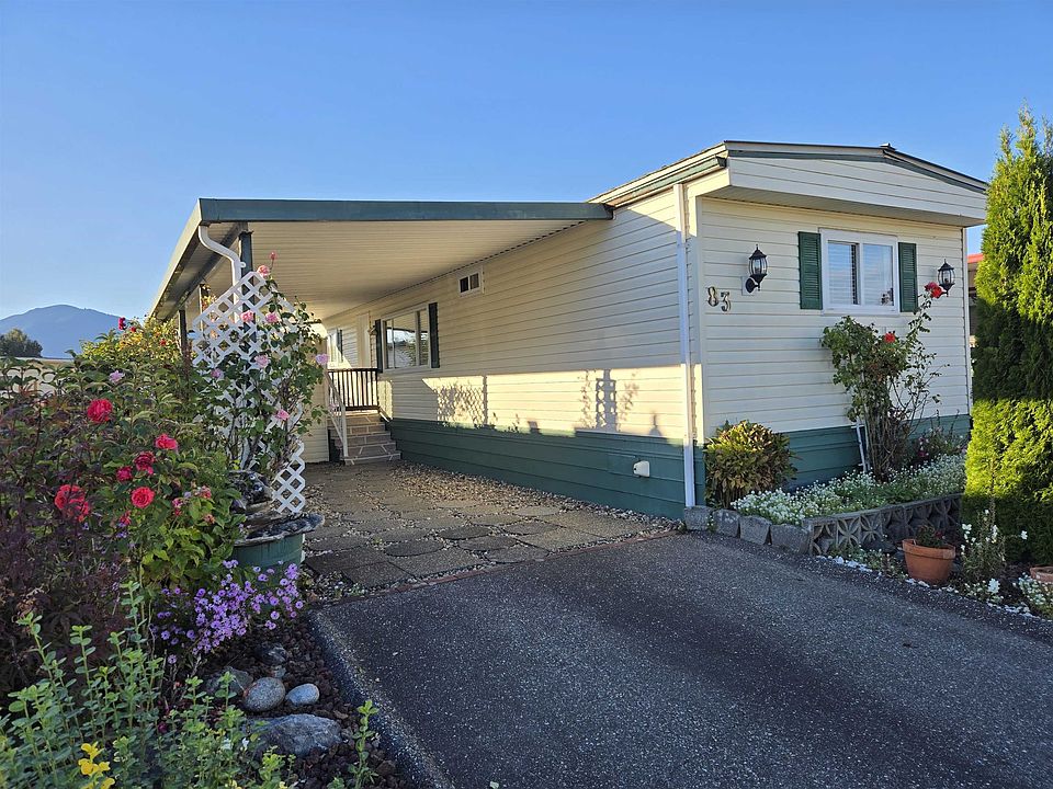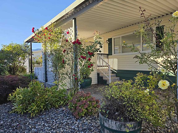 Embrace easy, comfortable, low-maintenance living in the desireable Rainbow Estates, 40+, secure, gated community! You'll love the peaceful, well-kept neighborhood with a large, active clubhouse, convenient on-site RV parking & scenic mountain views, centrally located near Eagle Landing Shopping, the hospital, grocery stores & Hwy 1. This bright 2 bed, 2 bath home offers an ideal layout with bedrooms on opposite sides, each with their own 4-pc ensuite with bathtub. Features include central Air Conditioning, metal roof, covered carport (25'x11'), covered patio (12'x11'), detached shed/workshop (11'x7.5'), & an easy, low maintainance yard. 2 pets welcome. Lease extended to 2072, pad rent $495/month. New silver label & electrical upgrades completed with permit. Quick possession available!