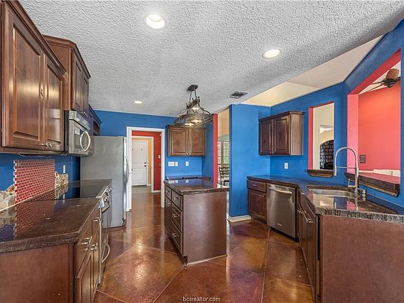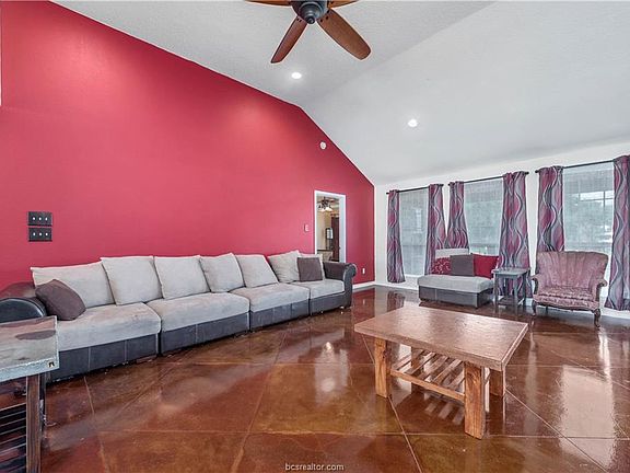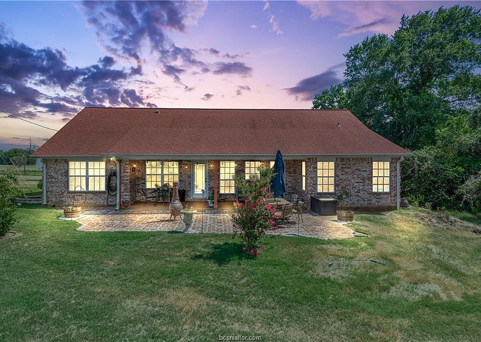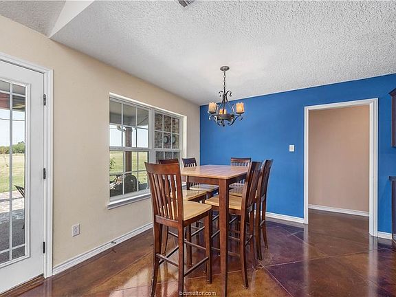 Custom home on 5 acres just 20 minutes to College Station! Open concept with a split Bedroom Floor Plan. Master Bedroom Suite has a separate jetted garden tub and shower. Step out the door in the Master bedroom onto a small patio to enjoy a soothing view of Mustang Grape Vines. Cultured marble counter tops in both bathrooms. Beautiful stained concrete floors throughout. All appliances will convey. Kitchen has a separate walk in pantry and concrete countertops. Relax in the study/den with wired-in surround sound or on one of two covered patios. High Energy efficient home with 15 seer AC, 30 yr architectural shingle roof and double paned windows that are double hung for easy cleaning.