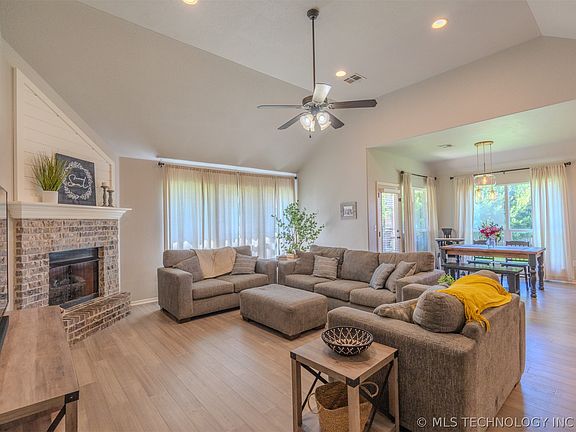 This home is a 4-bedroom, 2-bathroom home (Plus bonus room upstairs) located in the highly sought after North Bixby area. Experience an inviting space with vaulted ceilings and an open layout. The primary suite in this residence is spacious, offering a bathroom with a tub, a full shower, and a walk in closet. There are also three additional rooms, with one of them adaptable to an office if you prefer. The living room is graced by a cozy fireplace, an ideal spot to savor your morning coffee. The kitchen includes hand painted tile with new quartz countertop, complemented by a charming nook - perfect for hosting and enjoying quality time with loved ones. Garage accommodates two cars with a separate space for storage or a workshop. Back yard includes a cozy gravel firepit - making it the perfect place for making memories. This house will not last, come see it today!