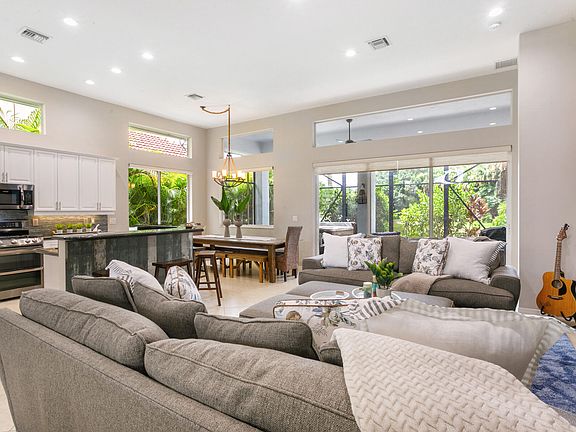 PRIVATE LAKE VIEWS and lush tropical greenery surround this lovely 3BR/2.5BA+Den home. With a NEW ROOF, new gutters and freshly painted exterior in 2024 - the hard work is done for you! Move in and enjoy the Ibis experience in this lovely open floor plan home from day-one! The formal living and dining area has been reimagined as a game room perfect entertaining family and friends. The soaring ceilings, spacious foyer and expansive windows in this area allow this versatile space to easily accommodate a more formal and elegant vibe if desired. The kitchen has newer black stainless appliances, a casual dining space, counter seating and an adjoining family room with plank feature wall. Stacked slider provides a generous opening to access your screened lanai with private spa (cont) and ample room for lounging or grilling. The spacious main floor primary wing features a stunning lake and fountain view! Two amazing walk-in closets with new custom built in organizers PLUS third closet with built ins for shoes and linens. Beautiful new stone countertops on the vanities, and newer plank flooring through-out the suite. Separate water closet provides privacy. Also on the main floor is the den which is currently set up as an additional bedroom and a renovated powder room. Upstairs, two generously sized bedrooms share a Jack and Jill bathroom with updated vanity. Newer plank flooring on the entire 2nd floor. New recessed LED lighting throughout. Hurricane protection and a newer A/C provide peace of mind. The Grande is conveniently located close to the front gate and the clubhouse. It's the only single-family home community in Ibis which offers use of a private community pool. The Club at Ibis is an award-winning community that boasts 3 Nicklaus-designed golf courses, 20-acre practice facility, 16 tennis courts, 7 pickle ball courts, 4+ restaurants, fitness center with spa/salon, resort style pool and lap pool. 24-hour gated security and impeccably landscaped grounds. Come enjoy the Florida lifestyle!