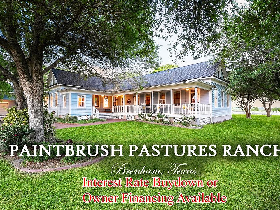 Available interest rate BUYdown so the buyer can get a lower rate with this home- Contact agent for details. Paintbrush Pastures Ranch is an 87-acre cattle ranch with a scenic Live Oak-lined drive leading to a charming homestead on a hilltop with breathtaking views. Originally built in the 1920s with later additions. The interior features include refinished hardwood floors, 12' ceilings, a stone fireplace, sunroom, 2 studies, 3 large bedrooms, & large windows offering stunning views. The gourmet kitchen with a Viking range & double ovens. Enjoy sunsets & springtime flowers from the spacious front porch. Improvements: recent 30-year roof, water heater & updated plumbing. Ranch amenities: oversized 2-car garage, 3 barns (4 stalls), 2 large ponds, hayfield in production, cattle chute & 4 cross-fenced pastures. Over 3,400’ of road frontage on Sam Houston Rd & Little Rocky Rd. Just 1 mi to historic Independence, 10 mi to Brenham, 28 mi to College Station & under 2 hrs from Austin/Houston.