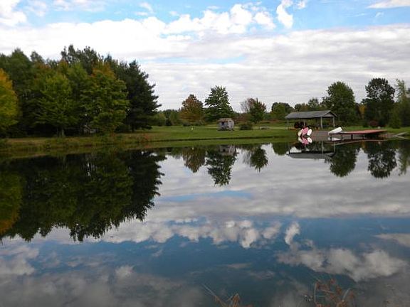 The 1,288 sq. ft. ranch-style house built in 1989 with 3 car garage includes 3 bedrooms, full bath, large eat-in kitchen, and large family room with French doors leading to a large exterior deck. The exterior is maintenance free with vinyl siding and new architectural shingles. The poured wall basement foundation includes French doors for easy access, woodstove, laundry area and the 3rd bedroom.The largest pond with pavilion includes a large wooden dock with diving board, gravel beach and building for changing.
