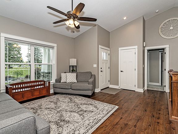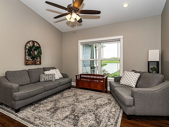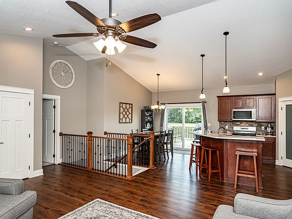 This gorgeous acreage, built in 2019, sits right on the outskirts of town and is the perfect place to watch both the sunrise and the sunset, either right there on the front porch swing or out on the back deck. After the sun sets, head on down to the fire pit or hot tub for a great end to your evening! The property also features beautiful landscaping, playground, and a 20x24 shed, complete with a loft for extra storage. The 3-stall insulated garage with 8' doors will hold your cars and your toys as well! Built with 2x6 construction, vaulted ceilings on the main floor and 9' ceilings throughout. Kitchen features a walk-in pantry, Whirlpool appliances, quartz countertops and soft-close wood cabinets with dovetail drawers. The mudroom/laundry area is right off the garage and has a nice drop zone to contain all of your outer gear/backpacks, etc. The primary bedroom has large closets, an en suite with full bath and is on the opposite end of the home from the other 2 main floor bedrooms. Another full bath, dining area and living room complete the main floor. In the finished lower level, you'll find the family room, full bathroom, the 4th bedroom, office area, storage area and a safe room, completely situated under the large front porch to serve as shelter during those Iowa storms. Solar panels were installed in 2023 by Pure Light Power and the last utility bill was just a little over $38, includes gas/electric. Small town living in this beautiful new build is just waiting for you!