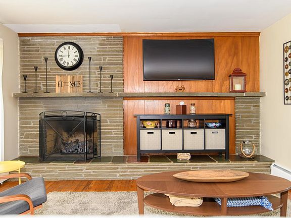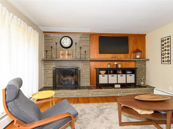 Prepare to fall in love with this immaculate all brick MCM ranch with a preserved past and modern where it counts! As you approach on the wide street in the most adorable town, you will see this home is like no other! Very large lot, backing the school for privacy and great architectural lines. The foyer features an open view thru the FULL floor to ceiling windows that overlook the incredible outside space. The front facing kitchen features a ton of natural light, granite counter tops, updated appliances and access to the one car garage. The open concept living/dinning room features hardwood floors, the original fireplace with flagstone hearth and a cozy vibe. The 2 nice sided bedrooms feature natural light, closet organizers, hardwood floors and share an almost new full bath! Outside, now we are talking, huge covered patio with hot tub (to remain), fire pit, 2 sheds and no rear neighbors. The finished lower level features a family room with wet bar plus half bath, storage and laundry area with access to the yard thru the bilco door. They say a picture is worth a 1000 words, look at the photos and prepare to fall in love!