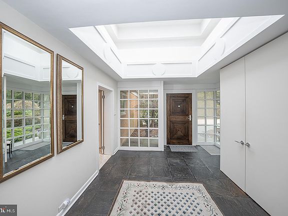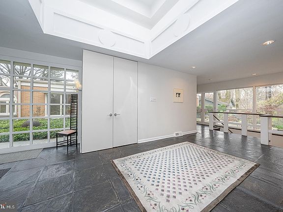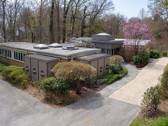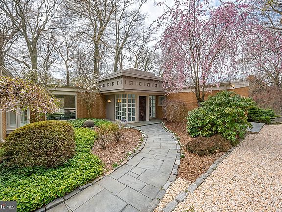 Nestled in a picturesque landscape, this breathtaking post-modern home is a true masterpiece of architectural design. Originally designed Henry Magaziner, then redesigned by renowned Frank Weise, the home boasts unique geometric shapes, floor to ceiling windows flooding the home with natural light, and clean lines that define the exterior as a blend of modern and classic architectural elements, creating a timeless yet contemporary feel. The long driveway meanders from the street, lined with stately maple trees, Magnolias with their majestic presence.The flagstone pathway leading to the courtyard entrance is bordered by lush greenery, weeping cherry trees, fragrant roses, and antique garden ornaments amidst the flora.Once inside you’ll be greeted by a custom made door & a grand atrium with skylight domed raised ceiling with recessed uplighting, glass latticed surrounding walls, custom paneled surround, and polished slate floors. The living areas are spacious, bright, and open. Classic marble flooring extends throughout the Dining Room, and Kitchen. The Kitchen features vaulted beamed ceilings with recessed lighting, wood cabinetry, stainless appliances, microwave, double sink, and exit to the outside. A wonderful prep Kitchen adjoins the main Kitchen area, making food preparation and entertaining a breeze.The prep area has a breakfast bar and large passthrough to the Dining Room. The dining room is a breathtaking space, filled with dramatic light that filters through the floor-to-ceiling glass sliding door. The vaulted beamed ceilings add an air of grandeur to the room.The glass sliders open to a large deck, seamlessly blending indoor and outdoor living. The deck which is the entire lenght of the house, ideal for dining , & lounge seating. The very spacious, light filled, Living Room can be accessed from the Dining Room or Foyer. The Living Room features an original brick fireplace that matches the exterior brick, and high beamed ceilings. A built-in wall to wall bookcase and recessed ceiling lighting add to the sophistication. Features include Original teak floors, 2 floor to sliders open to the deck that runs across the length of the house, with beautiful views. A third sliding glass door opens to a private courtyard, with flagstone and beautiful plantings.Continuing down the hall there is a beautiful all marble guest bathroom with marble shower.The den with handmade doors offers a cozy retreat with a large window.The den features built-in TV area, and a wall to wall book cabinet. The romantic bedroom suite is a haven of elegance and luxury, featuring an abundance of natural light, with large windows creating a bright & airy atmosphere,& custom window shutters. The custom-made cabinets & The platform bed are a centerpiece of the room, The ceiling in the bedroom suite is custom-designed.The suite includes a walk-in closet,& a dressing table. The en-suite bathroom is a luxurious retreat, featuring all-marble finishes that exude opulence. A custom shower, & double sink vanity are elegantly designed, The custom designed jacuzzi, is set against a marble surround with ambient lighting. Skylights in the bathroom allow natural light to flood in. 3 more spacious bedrooms on this level. Custom new hall bathroom extension with tub looking into private courtyard garden through double shuttered window, separate shower with white Scandanavian tile. Attractive Stair case off foyer with glass wall cascades into the walk out finished Lower Level. Lower Level has wood floors, powder room, laundry & utility room. Double French glass doors lead to a spacious, bright family room, fireplace , custom made floating bookshelves, & two sliding glass doors to patio, connecting paths through gardens over stream to the private extra large swimming pool. Completing the lower level is a carpeted office with sliders to the outside, & adjoining 5th bedroom with full bathroom. Additional features: generator, storage shed, 3 zone climate control