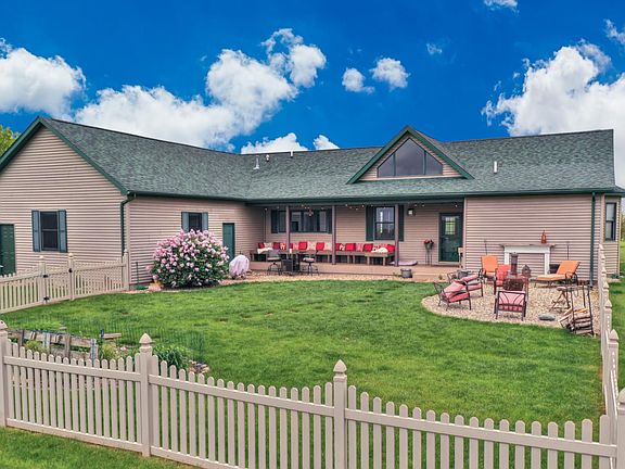 Custom, carpenter built, one level ranch... on two full acres with wide open, prairie views in all directions! Scenic, serene setting with just the perfect size acreage to enjoy. Owners have recently invested over 75K in upgrades/addons so you can just move in & relax! One-of-a-kind property is also the perfect "mini farm", all set up for horses, dogs, ducks, cats & chickens! Bright, happy, spacious home with unique features & personality plus! Popular open layout with gleaming hardwood, custom woodwork & 36" solid 6-panel doors. The cozy fireplace, soaring vaulted ceilings & extra large windows create a warm, inviting atmosphere with plenty of views to enjoy nature in all seasons. Wide open, chef's kitchen with quality cabinetry, granite counters, stainless appliances & an endless country view from the long window over the sink. HUGE eat in kitchen space with beautiful bay window & plenty of room for a large country table & hutch. Super "split-bedroom" design with wired surround sound through out. Private, spacious master suite with a second bay window. Enormous & amazing master bath is like a spa retreat! Oversized, walk-in-shower with custom tile on walls, floor & ceiling, arched door, bench/seat & double shower heads. Free standing soaker tub & two separate vanities. Master closet is larger than some bedrooms! On the other side, two more nice sized bedrooms, share a large bath that has a unique whiskey barrel vanity. Convenient laundry room (close to kitchen & also right off garage) Newer, front load grey/chrome washer and dryer convey. Huge closets, with tons of storage. Extremely high quality ~50 x 40 outbuilding has concrete floors, 220 amp service, floored attic storage w/pull down stairs & 5 custom kennel areas that's perfect for small business. Outbuilding is incredibly energy efficient with it's own high eff. furnace, 6 inch walls plus an extra 2 inch layer of foam insulation. A large beautiful office located privately with two entrances (inside & outside) Perfect for those zoom meetings or school sessions. Amazing shop, man cave, entertaining area is set up for a TV. Bonus, property is natural gas & electric (propane only for outbldg) Brand new,10K, top-of -the-line, high eff. 2-stage furnace/duct work (2021) Brand new, 20K complete tear-off, architectural shingle roof w/transferrable warranty (2019) Foam & fiberglass triple insulation upgrade on all low-e windows/doors (2020) New garage door, water heater, reverse osmosis, smart thermostat & modern LED dimmable ceiling light fixtures. Whole house generator, 200 amp disconnect power, recent survey completed & passed radon test. Built in, oak cabinets & new epoxy floor recently added in attached 2.5 bay garage. New horse barn w/stalls, fenced pasture & dry lot added (easy to convert to play space for kids or storage) Fencing installed & paddock area built. Small chicken coop tucked away behind. Fruit trees planted (peach, apple pear) border bushes, gardens & plantings added. Charming maintenance free front & back porches are positioned to view both the sunrises & sunsets. Extended family coming to visit? They'll be thrilled with the new RV 50 amp disconnect located on the acreage. (currently houses a cozy, beautifully finished, cabin that may be available for separate purchase) Various sitting areas/fire pits/picnic tables/grilling areas that make this the perfect place for friends & family to gather! Newer ranches with acreage are always in demand, but rarely available. Call today... start enjoying simple country life & living the dream!