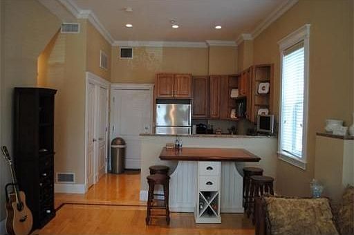 One bedroom bi-level Brownstone, sought after City Point location! Open kitchen/living area is perfect for entertaining with hardwood floors and 12' ceilings. Granite counters and stainless steel appliances in kitchen; large half bath on main level. Stairs to lower level lead to "plus" room with gas fireplace; perfect for office or den. Full bath with jacuzzi tub and granite counters. Plenty of closet space throughout the unit, private laundry in unit.
