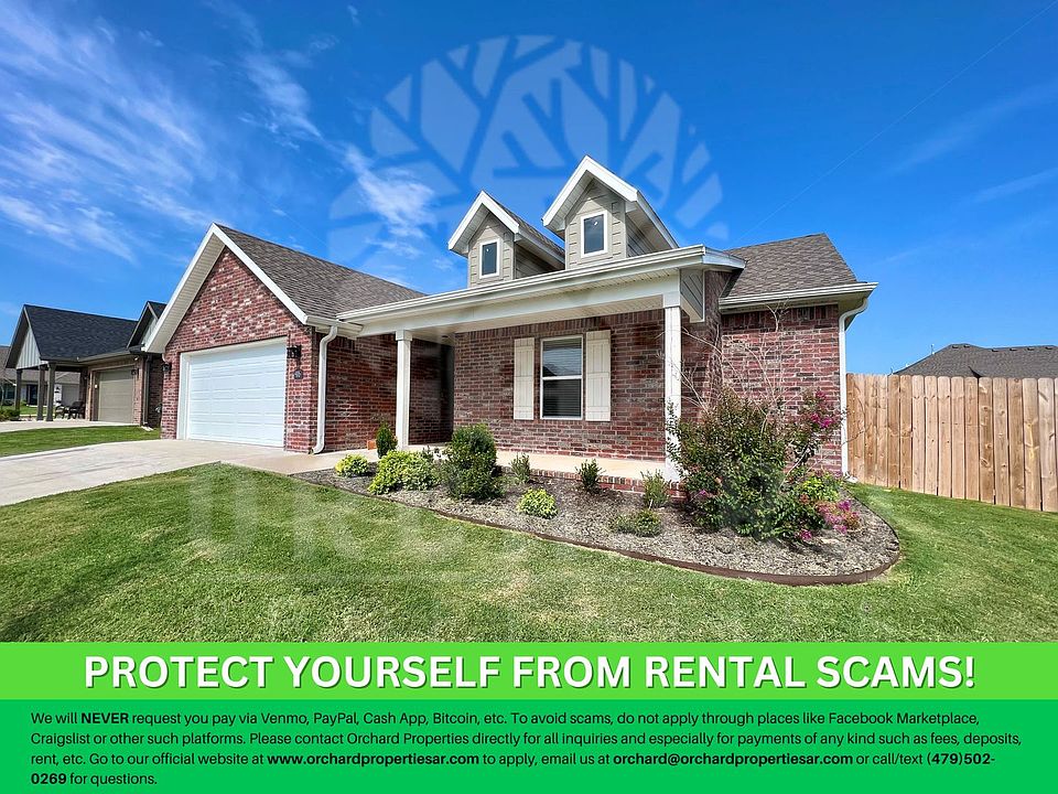 Beautiful 3 bed/2bath/2 car garage home. This home is located in Tontitown, AR in the lovely Hickory Meadows subdivision which features a neighborhood pool and park area with playground. Pet Policy: $500 non-refundable pet fee when applicable + $50/mo pet rent; Two pet limit per home, 50 pounds maximum for 1 pet, if two pets combined weight must not exceed 35 pounds. No vicious breeds allowed. Additional refundable security deposit is required if cat is not declawed. Max of 2 pets per home or unit. Please check with management to confirm if pet qualifies for approval. Orchard Properties reserves the right to refuse certain breeds. Applicants should check with property management prior to applying if they feel their pet might be questionable. In the event an animal is not approved. applications fees remain non-refundable.