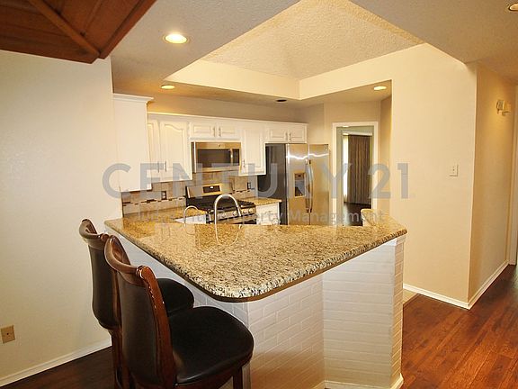 Modern lightingCharming brick fireplacePrivate backyard oasisPlush carpetingAmple natural lightDark wood-look flooringGranite countertops