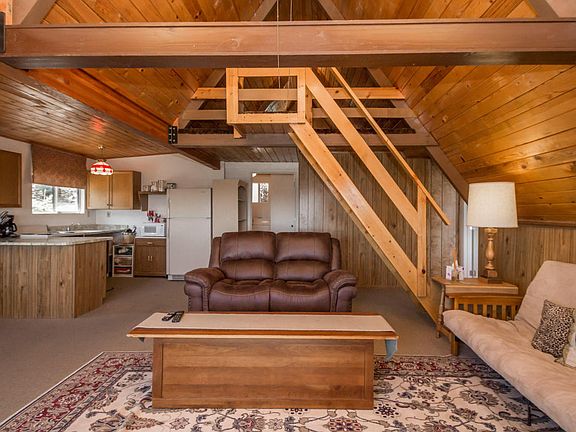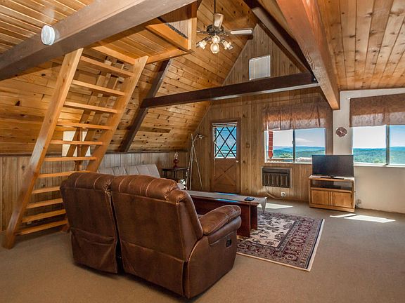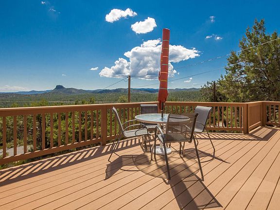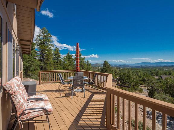 Amazing views of Prescott, Thumb Butte, Granite Mtn, Mingus Mtn, San Francisco Peaks, Bill Williams Mtn all seen from the deck of this Cabin Home in beautiful Highland Pines. Property features spacious Master Suite, a 2nd bedroom and a loft. Tongue and Grove ceilings throughout interior. 2 fireplaces (1 wood burning, 1 pellet stove - both produce comfortable heat). Pellet stove has served a dual role by keeping electrical expenses low in winter. All furniture (except kitchen table) conveys with home. This includes smart T.V. Detached workshop/storage shed (could fit quads). Home sits on a large .84 acre lot. HOA membership is voluntary and inexpensive. Property is listed by Owner Agent.