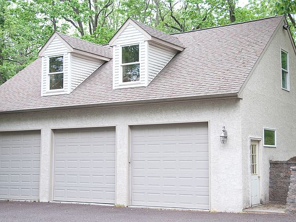 Welcome to this wonderful, custom built, brick front home nestled on a wooded and private 2 acre Lot on charming NORTH Trooper Road. The 1st floor of the spacious 4,000+ sq. ft. interior features a Study, Living Room with hardwood floors, hi-hat lighting and cozy fireplace w/ wood stove insert, formal Dining Room, Island Kitchen w/ Breakfast Room overlooking a Family Room w/ vaulted ceiling with skylights and sliders to an elevated deck overlooking the park like rear yard. Completing the 1st floor is a Powder Room, Laundry Room and In-Law Suite with Sitting Room, Bedroom and full Bath. The 2nd level features a spacious Master Suite w/ Sitting Room, large walk-in closet, private Bath with jetted tub and separate shower stall as well as 3 additional large Bedrooms and a hall Bath. The finished, walk-out Lower Level has a large Recreation Room, wet bar, Exercise Room and a half Bath. The detached, 2-story, 3-car Garage with heat and electricity is perfect for the car enthusiast or contractor.