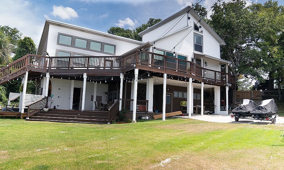 Beautiful Bay front home near Tyndall AFB. Deep water front on St Andrews Bay just minutes from Shell Island and the Gulf of Mexico. The home has a brand new metal roof and new flooring. The home boasts three levels with the main living area, new renovation of the kitchen, dinning room and two bedrooms on the second floor and panoramic views of the water , the second master room has 3 diferents doors to access to the deck or to the private balcony. The top floor hosts the first master bedroom and bath complete with a walk-in shower and a whirlpool tub. The first floor would be great for guests or older family members who desire privacy as this section has its own entrance along with two bedrooms and a bath. Also on the first level, tucked away on the west side of the deck has a 12x20 office. There is a double carport connected to a walkway leading to the front door on the second level. There is also a driveway that leads to the bottom of the property for extra parking. The property has a natural beach shoreline and deep anchorage, and you can't beat the view!