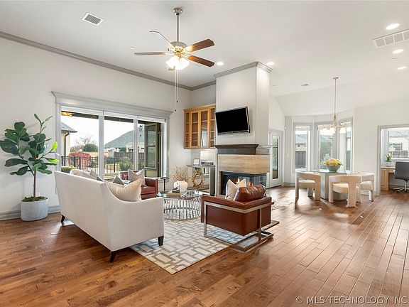 Luxury awaits in Tulsa's Hyde Park gated community! This single-story home boasts a landscaped yard, 3-car garage, dual fireplace, walk-in closets, covered patio, and open floor plan with granite counters. Enjoy a private office, four season room, and workshop all on one of the largest lots currently available. Community amenities include a pool, indoor pickleball courts, tennis courts, putting green, library, and game room. Perfect for downsizing without sacrificing community. Enjoy the incredible convenience of being only blocks away from one of the metro area's premiere Shopping and Dining Districts - Tulsa Hills. Live the resort lifestyle in Hyde Park!