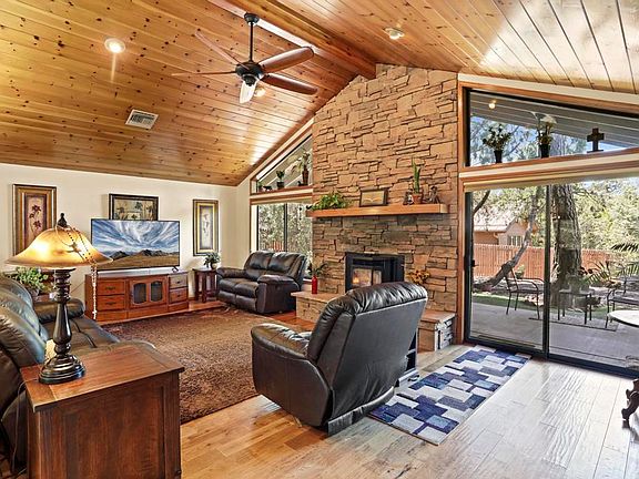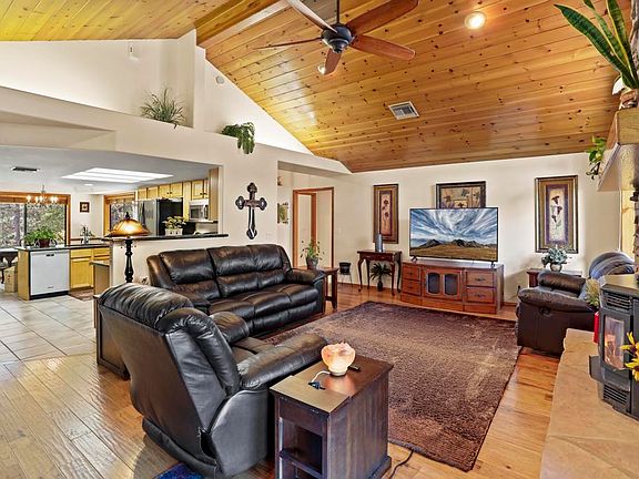 Wonderful single level home with 3 bedrooms, 2 full bathrooms and a 2-Car Garage. Foyer entry way that enters into a charming great room with vaulted tongue and groove ceilings, pot shelves, stack stone fireplace with a pellet stove. The living area opens to the private fenced backyard. The kitchen is an eat in kitchen, pantry and a breakfast bar. Master suite has outside access, jetted tub, shower and double sinks, skylight and a walk-in closet. The backyard offers a firepit and a large storage shed.