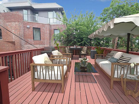 GORGEOUS RENOVATION and AMAZING 300 SqFt PRIVATE TERRACE are the major highlights of this beautiful 2 BR condo apartment. Large living/dining area, new kitchen with great cabinets, quartz countertop, stainless steel appliances, dishwasher, microwave, and gas range. Very high ceilings and new wood floors throughout, Central A/C, modern renovated bathroom, quiet bedrooms, and great closet space. Second bedroom is smaller yet fits full size bed and can be ideal for office or children's room. Enjoy the spacious outdoor deck all year round! Apt is just 1 flight up, located in a fantastic uptown location, steps to NYC buses, NY Waterway ferry, and a straight 15-minute walk to Hoboken PATH. Available for Feb 1st or possibly sooner.