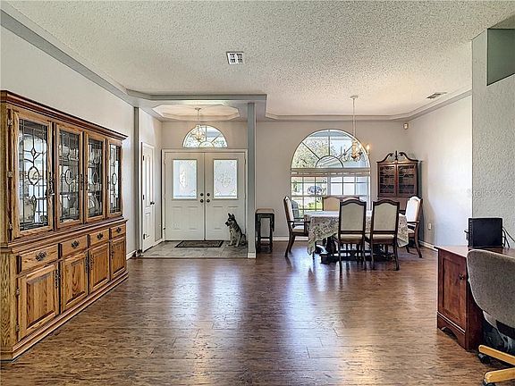 Wait until you see the size of this family room, its huge! You also get a formal living room as well. The flooring is ceramic tile and laminate with carpet in the bedrooms. The bedrooms are large in size and one bedroom has a walk in closet. The kitchen comes with all the appliances with white cabinetry and Planter shelves. The master bedroom has its own private entrance to the screened lanai. The master bathroom has a garden tub, double sinks, a walk in shower and a walk in closet. The screened lanai overlooks a beautifully landscaped lawn with 2 peach trees and two avacado trees. Beautiful neighborhood.