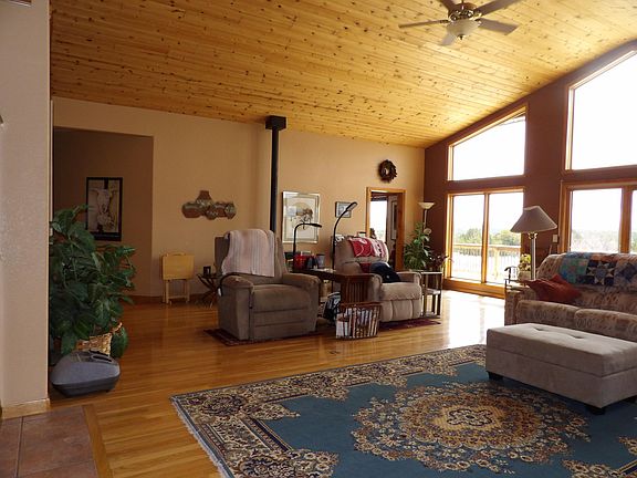 Sprawling Ranch Style Home with 90 acres Beautiful spacious open floor plan. Upon entering you will appreciate the spacious beautiful kitchen with large pantry, living room with hardwood floors, tall vaulted wood ceiling, pellet stove, and wall to wall windows to enjoy the westerly beautiful mountain views. Walk out to the large deck. Master Bedroom Suite on one end and 2 other bedrooms on the other. Master Bedroom has an additional office/sewing room attached, large walk-in closet, 5 piece bathroom. Bdrm 2 also has an extra 1/2 room for additional use. Bdrm 3 or Den has a Murphy Bed, wall to wall bookshelves. Full Bath Full concreted and insulated 4ft crawl space. 30x40 workshop w/220 electric, 24x40 Barn, Gazebo out back to just back and relax. Granite & Corian countertops comin