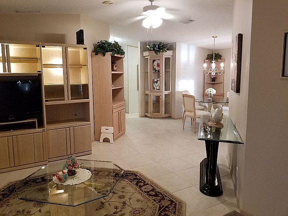 Our home is fully furnished and ready to move in, pots and pans and all and the property is included. Xfinity wifi and TV is included in the HOA fee. It is very roomy and comfortable. Since it is a lake front property the lanai is really a special place to enjoy the end of every day as the sun sets over the lake, some evenings are just incredible to see. The lanai has a separate air conditioner from the house unit. The house air conditioner was replaced in April of 2020. The metal roof was replaced in February of 2021. The irrigation is run off a separate well. Vaulted ceilings, tile floors, walk-in closet, eat-in kitchen and a dining room, utility room with washer and dryer, a 10 X 11 storage shed and a covered 8 X 11 laundry/storage area with a sink in the back of the house also, a 2 car carport and an extended drive way for more parking, 2 club houses and 2 heated pools, RV and boat storage.