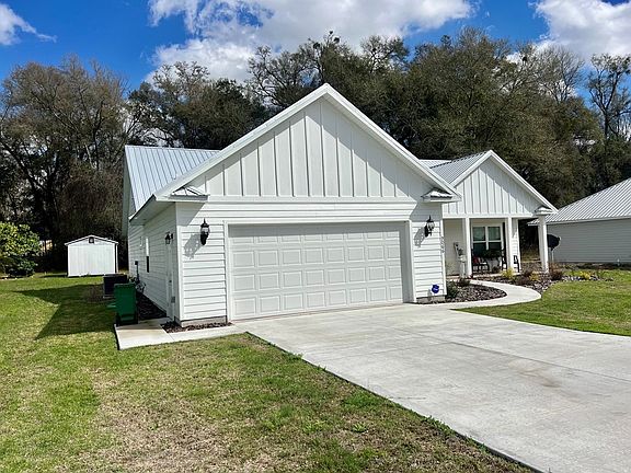 Gorgeous Like New Construction 3bd 2ba home located in the lovely gated Riverwalk of Fanning Springs. This home was built in 2022 & sits on a quiet loop that backs up to preserved green space. You will fall in love with this home & its spacious open floor plan & tons of upgrades! Vaulted Ceilings, Luxury Vinyl plank flooring throughout, beautiful granite countertops in kitchen & bathrooms, large island, Tiled backsplash, custom wood cabinetry & stainless steel appliances. The spacious Master Retreat features a vaulted ceiling, duel closets, double vanities & beautiful large tiled walk in shower. Sit & relax on your large back porch that spans the entire length of the home. More features include the 2 car garage, metal roof, hardi-plank / board & batten siding, landscaped/irrigated yard & new shed. The Riverwalk is a beautiful community that features A 6000+ clubhouse, gym, sauna, Pool, Tennis courts, walking/biking trails and more! Schedule a time to come & tour this beautiful home!