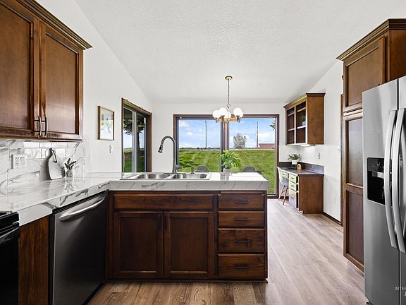 Views!!! 180-degree view of the mountains. Centrally located, single level, low maintenance patio home in the desirable Maple Hill Subdivision of Boise. Numerous updates in 2023 create a neutral, light, modern palette. Skylights and large floor-to-ceiling windows across the back of the house take advantage of the mountain views and flood the home with natural light. Home features vaulted ceilings, brand new flooring throughout, new counter tops in the kitchen and bathroom, new sinks and faucets, new lighting, stainless steel appliances, tons of cabinet space, wood burning fireplace and freshly painted inside and out. New air conditioner in 2019, new furnace in 2017. Unique home design creates a private front courtyard with covered front patio and covered back deck off the kitchen and master bedroom. Subdivision has beautiful common areas with ponds and pathways throughout. Located near shopping, entertainment & easy highway access. You won't want to miss this darling home!