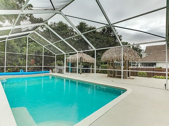 Live on vacation everyday in this gorgeous Mill Creek 4 Bedroom/2.5 Bath pool home that features an over-sized, solar-heated pool and expanded deck complete with tiki huts! Have a boat or RV? No problem here! Pull right into the parking pad behind a fenced area that is ready to house all of your toys and also serves as the perfect dog run. Major recent improvements include a NEW roof (2018), NEW solar system/panels (2019), NEWER pool cage (2017), NEWER AC (3-5 years), NEW interior paint and NEW berber carpet in the master bedroom. As you enter the home, you will be impressed by the 20-foot ceilings in the foyer and family room. French doors on either side of the fireplace lead out to the lanai and a lovely spindle staircase takes you to the secondary bedrooms and bathroom upstairs. The master bedroom suite is downstairs and has two walk-in closets, double sink, jetted tub with shower and sliding glass doors leading to a deck area. The kitchen has granite counters, newer appliances, above cabinet lighting, smooth top range, pantry closet, planning desk, and extra storage under the stairs. Other features include an indoor laundry with sink, half bath downstairs and outdoor shed that houses the rider mower and can be included with the right offer. Why not treat yourself and live the Florida lifestyle? Mill Creek is a large lot neighborhood with architectural diversity and charm all within minutes of the interstate, restaurants, shopping, beaches and everything the area has to offer. You will love it!