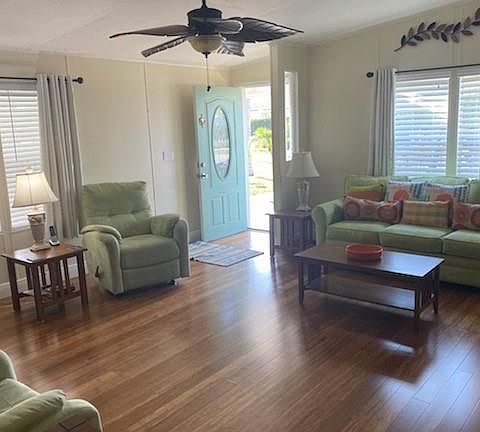 HIDDEN GEM LOCATED BETWEEN NAPLES AND MARCO ISLAND.RIVERWOOD ESTATES 55+ BOATING COMMUNITY. HOA $198. ANNUALLY. YOU OWN YOUR LAND This lot alone is valued @ $78,800. per Collier Property Appraiser. Community boat ramp and dock. 20 minutes to the Gulf of Mexico or lunch by boat in Naples or Marco Island. This built in 1992 Coastal feel 2 bed/2 full bath with den 1226 sq. ft. under air home comes turn-key. The entrance landscaping offers total privacy and street appeal. The backyard is your serenity space, tile deck with outside lighting and plenty of space to entertain guests or read a book. Mature Japanize Pear tree yeilds fantastic fruit. Beach color furnishings and walls make this home the total pkge. Bamboo flooring and tile throughout. Kitchen/ Dining/ Den flow into each other space is open and airy with an exit door off Den leading to back deck. Upgraded appliances, new refrigerator, lots of cabinet space. Large Primary Bedroom and bathroom. New Tie-Down Straps installed 2017. Roof 11 years old. Hot Water Heater 2 yrs. old. AC has annual service agreement. Shed. Whole House Generator and Cross Creek Pool Membership ($1,500. value)