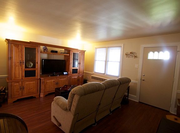 A budget balancer that will blow you away! Designed to delight, you won't want to look at another property. Pretty porch. Walk into the living room and you feel at home w/ new laminate floors that bring a modern flair, chair rail, and wide moulding fresh paint, arched doorway into huge dining room w/ ceiling fan. Eat in kitchen with white cabinets w/ new hardware, glass mosaic tile, double sink, beautiful new beveled counter top, ceiling fan. gorgeous stairway with all new landing & oak treads also a new railing.Upstairs has refinished hardwood floors throughout hall and bedrooms. master bedroom is a generous size, all bedrooms have fresh soothing paint colors & ceiling fans. Hall bath is remodeled with tile floor, and a decorator look with plenty of cabinets. Basement has half bath and laundry, new heater and glass block windows. Bilco door. Lovely fenced in yard with gardens on the side, patio to relax on. New roof, newer chimney flu and chimney cap. Verizon Fios. Don't miss this exciting new listing!