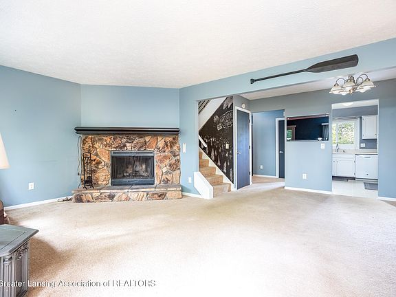 This three-bedroom condo lets you relax in a quiet and peaceful environment, yet it is still close to Grand Ledge for shopping and schools. The wood burning fireplace in the living room provides a cozy place to relax and warm up on those wintry evenings. The tree-lined back yard has a patio for summer fun. On the first floor is the kitchen and dining space as well as a half bath. The primary suite has a walk-in closet with built-in storage. A sliding barn door leads to the attached bath with an accessible walk-in shower. Updates include a new disposal, new kitchen faucet (2025), new roof (2024), new handrails and banister in the stairway (2024), and new hot water heater (2023). The association takes care of snow removal as well as mowing the grass. Schedule your showing today!
