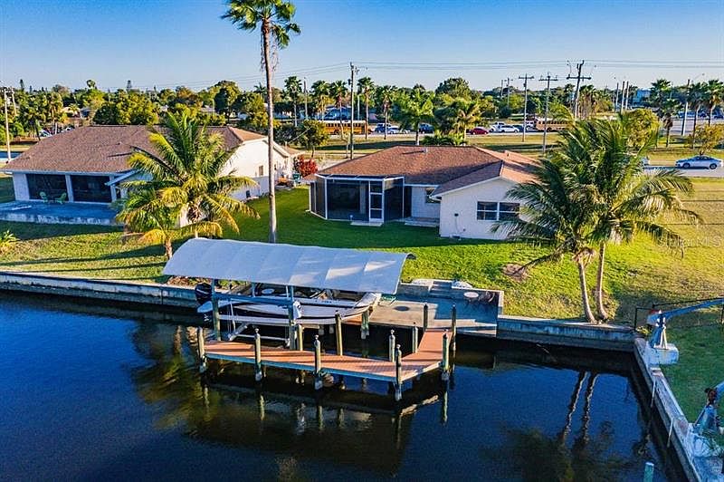This gulf-access getaway is perfect for those not wanting much maintenance. Over two thousand square feet include three bedrooms, 2 bathrooms (Master ADA Accessible), living and dining rooms, family and breakfast room with an island that seats several comfortably. The composite dock (2013) comes with an 8,000 pound covered boat lift with water and electricity (concrete seawall). Take the easy 20 minute boat ride to open water (2 bridges at worst case scenario 11 ft clearance). New in-house plumbing. Roof '14, A/C '10. Caged lanai leaves plenty of room for those wanting a pool. This home is in great, move-in-ready condition, and some items are available to stay! Vacant corner lot available for purchase! (listed separately to be sold under separate contract.)