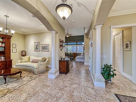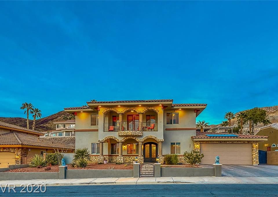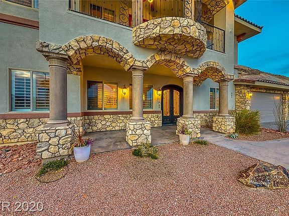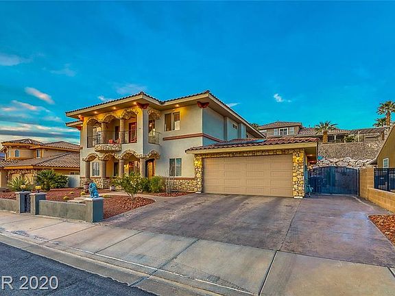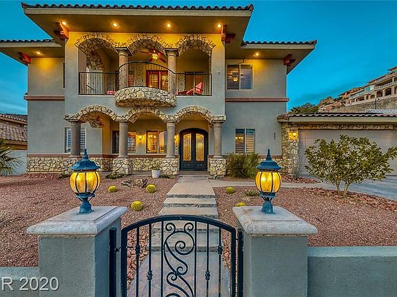 Custom beauty in Calico Ridge w/Strip view!Wrought iron door entry to large foyer,formal living & dining room.Gourmet kitchen boasts granite counters,custom cabinets & stainless appliances.Family room w/cathedral ceiling,shutters,stone stacked fireplace.Master w/en suite & dual walk in closets.Casita w/bath!Loft w/balcony & views.Media room w/projector.Private yard w/spa,covered patio,ceiling fan,fountain,fruit trees & garden area!Solar is owned!