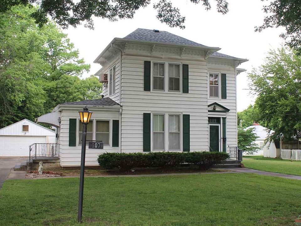 Spacious, historical home situated on a large shaded lot. This residence was once occupied by the Parks family. This home had loads of storage B/I's. It also boasts a large eat-in kitchen with lots of cabinetry, breakfast nook area, & W/B fireplace, Family room w/lots of natural lighting, 2 bdrms, 1.5 ba.. den, & office on the main floor.The curved stairway adorns the entrance to the second floor, which previously been used as an apartment with kitchette ,2 bdrm, & bath. Detached garage contains shelving for all your storage needs. Come take a look.