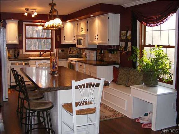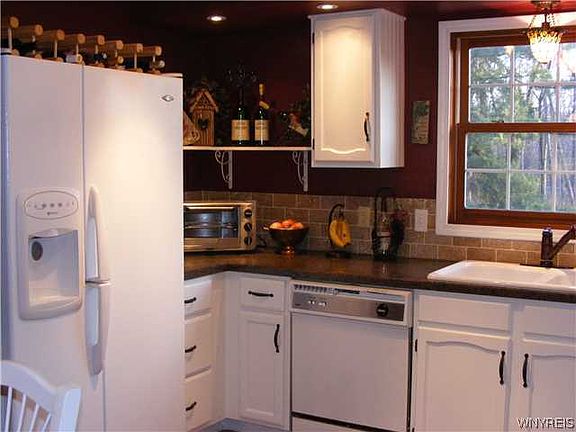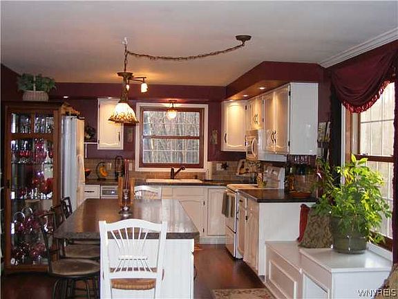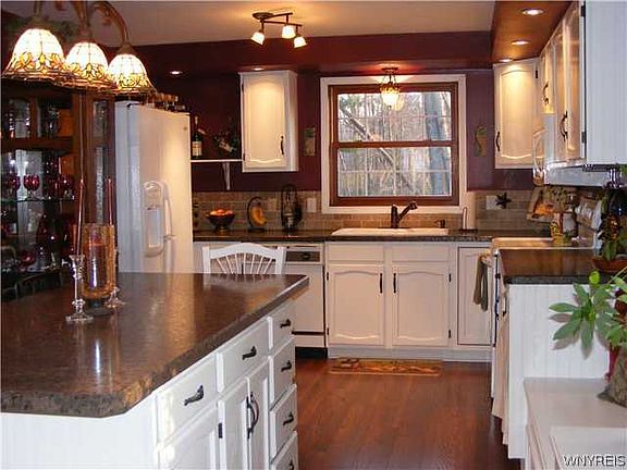 This charming home features a foyer w/double closet & tile floor. This updated kitchen boasts hidef countertops w/oversized island & breakfast bar, wide plank laminate cherry floor, custom built-in desk w/corner display shelving all overlooking the living room. Relax in the living room by the cozy gas fireplace w/brick surround, bay window, custom window treatments & berber carpet. Enjoy the convenience of 1st floor bedroom & full bath. The 2nd floor offers 2 bedrooms & full bath. The walkout basement offers an exit to the beautiful wooded backyard, shed & gazebo. Don't miss this one!