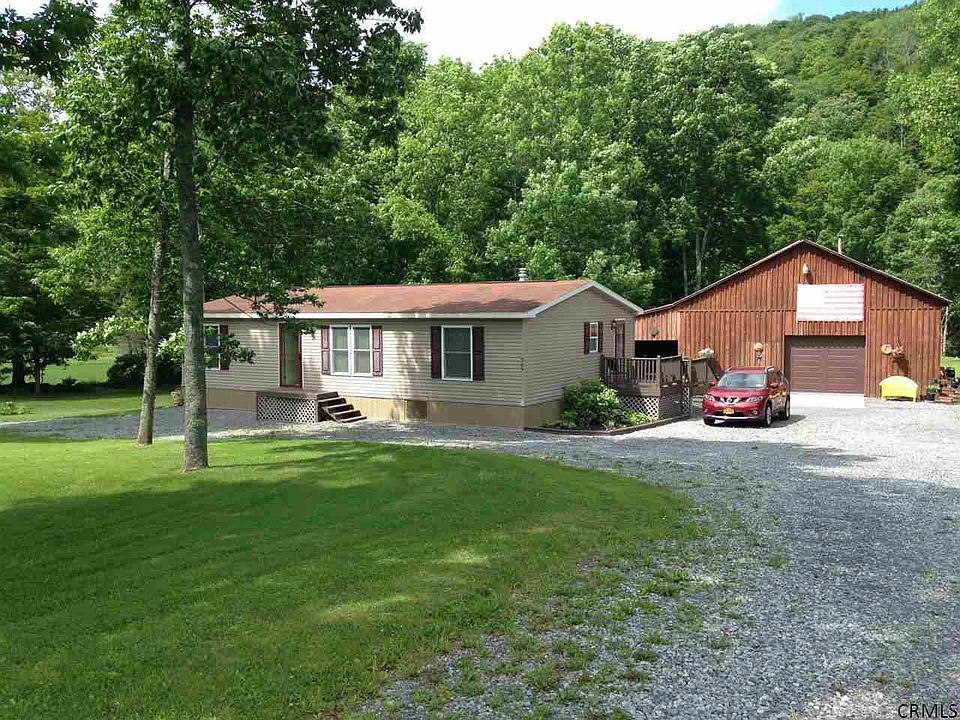 Pride of ownership resonates in this inviting & low-maintenance DBLWD ranch offering 3 bdrms, 2 full baths, a lg living rm, kitchen, laundry area, dining rm & family room w/coal stove. Enjoy sunny days on the side-entrance deck. Situated on 2 manicured acs, the property also incs an over-size garage w/vaulted ceiling, electric, a woodstove for heat, concrete flrs & extra insulation, auto. garage door & attchd single story bay for storage. Borders a deep-channeled creek on side & Catskill Creek at rear.