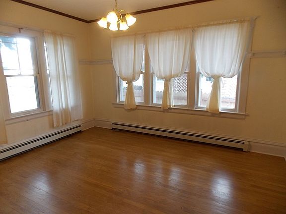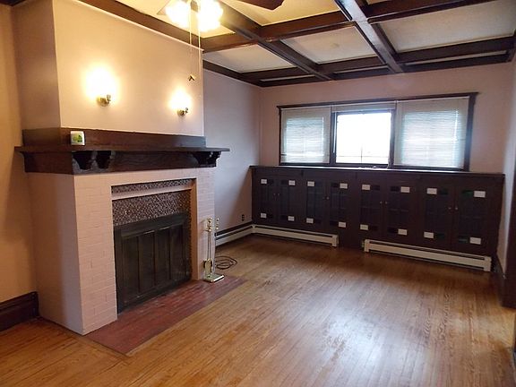 Beautiful pine trees grace the front entrance of this home! Enter through a bright & cheery front porch into the living room where you will enjoy beautiful hardwood floors, a fireplace, old style woodwork that has not been painted! There is a spacious kitchen and two bedrooms with a jack & jill bathroom between. The back yard has a nice private patio area. There is a large carport and an older style garage. Updates include a new 200 amp electrical panel and new boiler in 2000, new steel facia and gutters. Great starter home!
