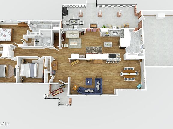 The home offers three bedrooms and two updated bathrooms on the main level. The primary suite includes a tiled walk-in shower and dual sinks, while the second bathroom also features dual sinks plus a tub.