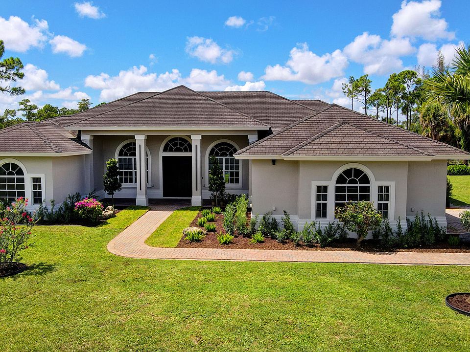 Sitting on over an acre of land, this stately home is truly the crowning glory of PB Ranchettes. Built in 2007, it's also one of the newest & largest homes (3696 a/c sq ft) in the community. Professional landscaping & exterior lighting offers stunning curb appeal! HIGH IMPACT DOORS/WINDOWS. Paver driveway/walkways. Upon entry, you will be taken back by the architectural detail of the living room/dining room. French doors to a fully tiled covered patio. Polished travertine floors in kitchen/family room with newly installed wood flooring thruout. Wet bar in Master Suite. Freshly painted interior and exterior! Chef's gourmet kitchen/custom white cabinets, subway tile backsplash, new quartz counters, restaurant grade SS appliances.SELLERS ARE IN PROCESS OF INSTALLING NEW $97K ROOF!! Sellers have not spared any expense! Split bedroom plan for privacy, the master bedroom features mahogany wood double door entry, two spacious walk in closets and a full master bath with roman Jacuzzi, step in shower with frameless doors and double sinks. Wet bar area with built in mini refrigerator conveniently located just steps from your bed!