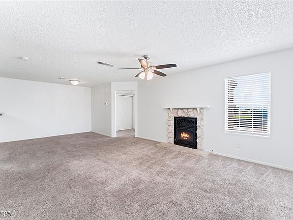wood burning fire place open to dining and kitchen area. Kitchen features breakfast bar, laminate counters,