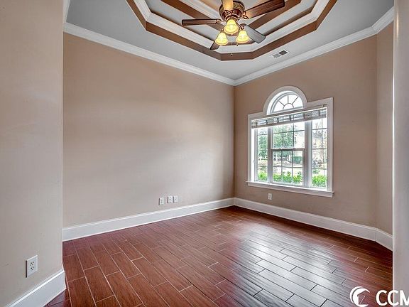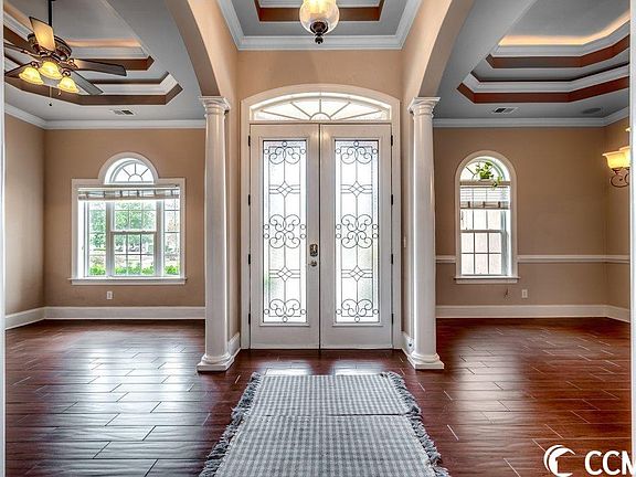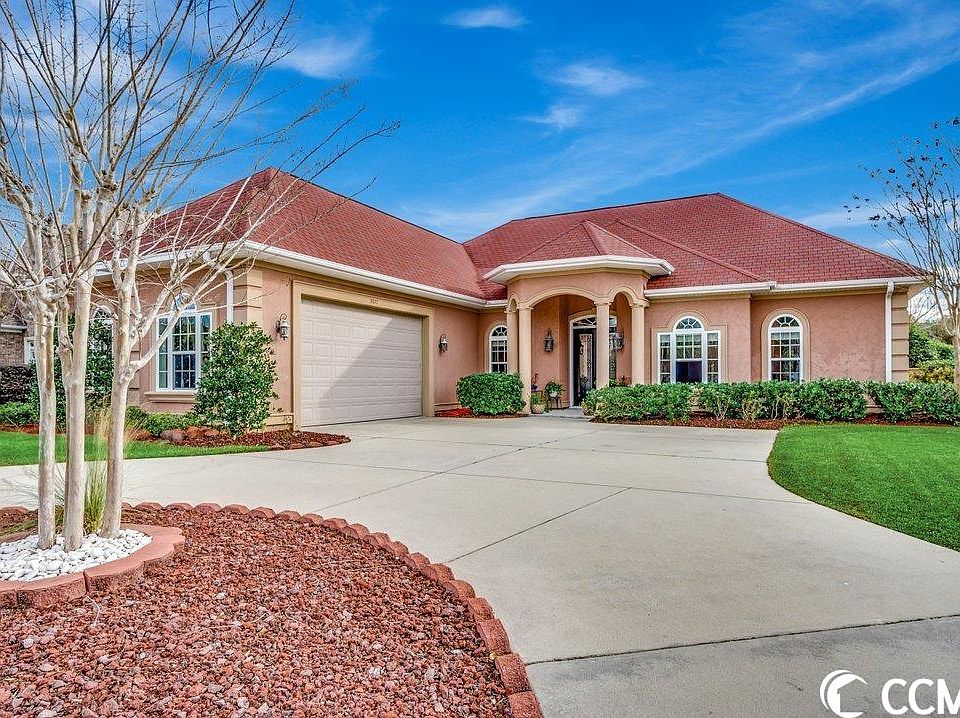 Elegant, Mediterranean-style, single level 3 BR/2.5 BA custom home loaded with upgrades! This Dream Home showcases many stunning architectural features, including a Formal Living Room and Formal Dining Room that greet you as you enter this gorgeous home, both with stunning double tray ceilings and columns. Master Bedroom is spacious and also has a double tray ceiling, along with a Master Bath fit for a king. Boasting double sinks, granite counter tops with an additional vanity, a separate tub and tiled shower and walk-in closet. Open Floor Plan allows for gracious entertaining and comfortable living. The split bedroom floor plan offers lots of privacy, and has a Family Room that separate the bedrooms and huge Kitchen. Tons of custom cabinets with raised panels, crown molding, granite counters and a gas range, along with a 2022 Smart Refrigerator. Adjacent to the Gourmet Kitchen is a generous Eating Area and an additional TV Room/Family Room with built-in cabinets. From there, you'll have access to the Outdoor Living Area, private pool/fountain combination and fenced rear yard. Lots of walk-in storage above garage! Close to all Myrtle Beach has to offer, including many fine restaurants, shopping and of course, the beach! Put this one on your "Must See" list. You'll be glad you did!