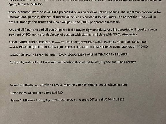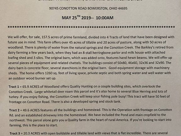 AUCTION - Coming soon on May 25th, 2019. (157.5 Acre dairy farm, prime farmland.) Plenty of water from natural springs & the Conotton Creek. We will offer up several pieces of equipment and related chattels. The buildings consist of 50x80, 46x60, 32x36 and 32x90. The home has 1260 sq of living space, private septic and both spring water & well water. Divided into 4 tracts of land; Tract 1 = 65.9 acres of woodland. Tract 2 = 49.6 acres features all buildings and homestead. Tract 3 = 20.3 acres with open buildable and tillable land with incredible views. Tract 4 = 21.7 acres of former pasture. We will sell this large farm with reservation of oil and gas rights. North Township, Harrison County. Frontage on both Bower Road and Conotton Road, BOWERSTON, OH 44695. (**See flyers in photos for even more information and details.**)