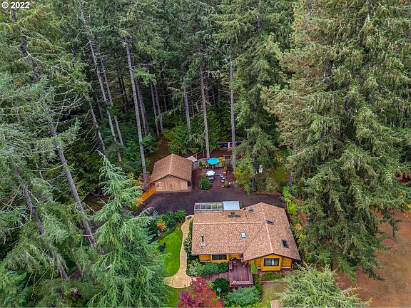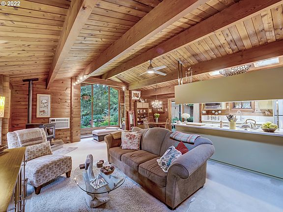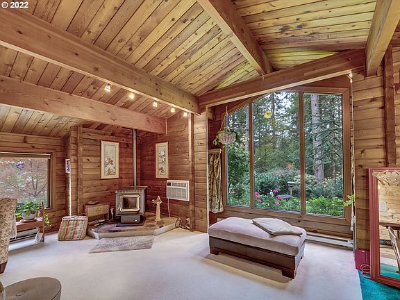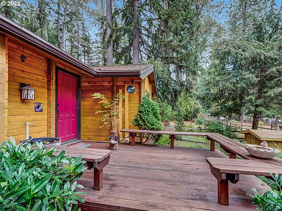 Private cul de sac location. PanAbode red cedar t&g log home, beautifully maintained. Nearly 2 acres lovingly sculpted with hand crafted trails and a large 2+car garage/barn, front porch/deck, back covered deck and two-level separate deck. Dog run, loafing sheds/covered storage. Newly remodeled kitchen, wired for dw. Wood framed thermal windows and skylights throughout. 15 minutes to town! 1 mile to Fern Ridge dam/yacht club. Apples, blueberry and fig trees. Pasture. ALL NEW CARPET.