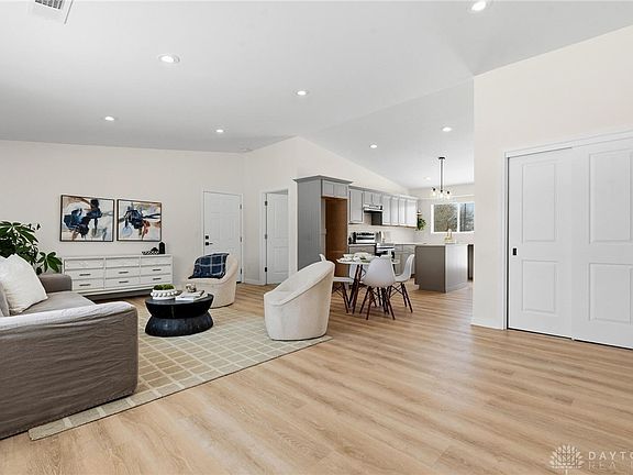 Fully renovated throughout, this 3-bedroom, 2-bath ranch in Clearcreek Township, offers 1,312 square feet of move-in ready living in the Springboro School District. The open main living area features vaulted ceiling, abundant natural light, and a cohesive modern design carried consistently throughout the home. The kitchen anchors the space with tailored cabinetry, stone countertops, a functional island, tile backsplash, and recessed lighting, flowing seamlessly into the dining and living areas finished with durable vinyl plank flooring. Bedrooms offer a clean, comfortable retreat with plush carpet, including a spacious Primary Suite with a private en-suite bath. An additional full bath adds everyday functionality and reflects the same thoughtful finishes. This comprehensive renovation addressed both style and major systems, including a new HVAC system (2025), new water heater (2025), and an upgraded 200-amp electrical panel. Windows, exterior doors, and the garage door have all been replaced. Refrigerator, Dishwasher and Gutters to be installed prior to Closing. Situated on a large lot, the property includes a storage shed. Exterior improvement also includes a new driveway. Come see this home today!