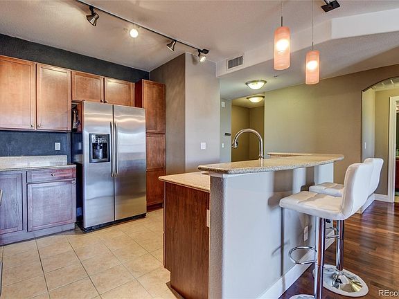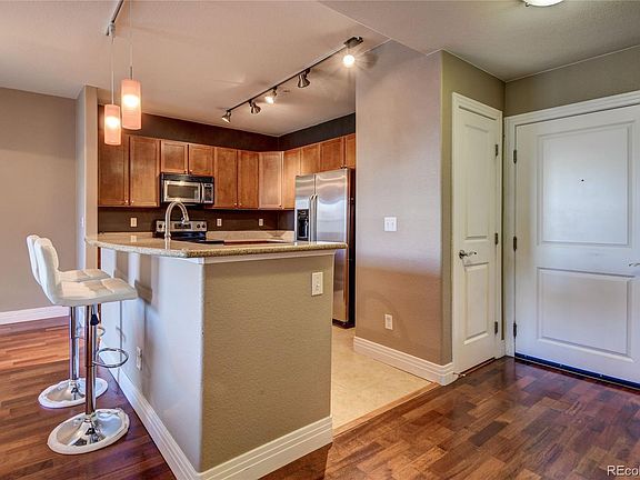 This home shines with Cherry wood floors and abundant kitchen cherry cabinets, Granite counter-tops, and stainless steel appliances. The great room has a gas fireplace with tile surround and a ceiling fan. The unit has a Contemporary floor plan with a boxed-out bay window and an open living / kitchen area.This unit features a carpeted bonus room that can be used as an office, study, den, children's area, or a place for a sofa /sleeper. The laundry closet has a washer and dryer that are staying. The master bedroom has a ceiling fan and a walk-in closet. The bathroom has a tiled floor, a double sink with a large soaking tub. The over-sized covered balcony , has access by a framed patio door. There is a direct gas connection for the gas grill, that is staying. This unit takes advantage of the natural southern exposed ,Colorado sunlight. This is an end-unit, with easy access to the elevator and the garage parking space (is the 4th space from the lobby door ) and private storage. This home has all you'll need and is within minutes to The Light Rail, Park Meadows, restaurants and trails. Community features include outdoor pool, hot-tub, workout facility,4,000 sq.ft. clubhouse with kitchen/bar and a business center. This home is a must see.