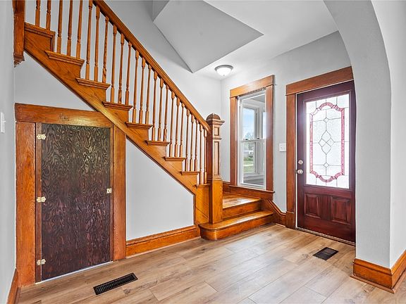 This home has been beautifully restored while maintaining the look of the original home! Walk through the enclosed front porch and in through the door of your new home and be wowed by the gorgeous new flooring, neutral paint colors, and grand staircase. Continue walking to the formal dining room with the show stopping chandelier and shiplap wall. The kitchen features all new cabinetry, countertops, industrial shelving, and stainless-steel appliances. On the main level you will find a remodeled half bathroom with main floor laundry, and bonus room that would make a great office, or with doors even a bedroom. Walk up the staircase to the second level which features a remodeled bathroom and three bedrooms. The lower level is partially finished. The attached 2 car garage is oversized with tons of space. New updates- kitchen, bathrooms, paint, flooring, light fixtures, electrical panel, water heater and more.