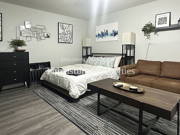 This fully furnished studio apartment is move-in ready and designed for both comfort and convenience. A charming stone path leads you inside, where durable vinyl plank flooring flows throughout the space. The thoughtfully furnished interior includes a bed, couch, coffee table, desk, dresser, and two mounted TVs, everything you need to settle in with ease. The bright kitchen showcases beautiful white shaker cabinetry, ample storage, stunning countertops, and an over-the-range microwave. Kitchen essentials are already provided, including utensils and a Keurig coffee maker for your morning brew. The spacious full bathroom features durable ceramic tile, an updated vanity, and a stacked washer and dryer discreetly tucked away for added convenience. One street parking spot is available. Utilities, internet, and lawn care are an additional flat rate of $150 per month. Pets are welcome, breed and weight restrictions may apply. Application fee $55 per person 18 and over. Lease Term: 12 months.