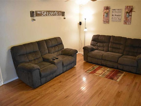 INTERIOR PICS NOW POSTED! Come see this charming 3 bedroom, 2 bath home with large fenced in level yard and a deck to enjoy quiet, small town living. Conveniently located near local shops, restaurants and schools. Plus, only a few minutes from I-70 for easy commuting. This home is on a spacious corner lot with several mature trees. It has a newer roof (2016) and sewer main with sump pump and pit (2015). Tilt-in windows, 3/4" hardwood floors in the living room and new carpet in the master (2017). New tile in the kitchen (2018), newer water heater (2015) and an over sized 2 car garage. The full basement adds extra storage and a finished room that can be used for sleeping or office/den.