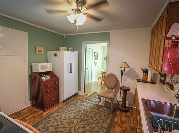 This property offers 2 bedrooms, 1 bath kitchen and separate dining room. Beautiful original hardwood floor, replacement windows. Single car detached garage. Newer low maintenance metal roof. This home is very clean and move in ready. Seller is offering a home warranty.