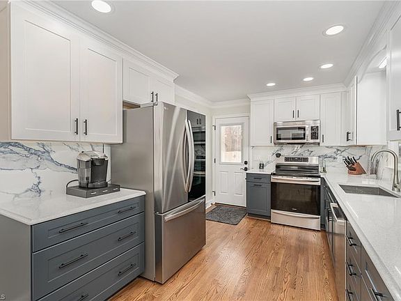This well-maintained 4 bedroom, 2.5 bathroom home boasts site finished hardwood floors and crown molding throughout. Completely remodeled kitchen (December 2022) includes new cabinets with soft close hinges, stainless steel appliances, induction range, quartz countertops, built in microwave, and Italian tile backsplash. The primary & second bedroom have custom designed closet systems with built-in dressers. Back yard backs up to a large wooded area. The 600+-square-foot back deck (2020) offers ample space for outdoor activities and entertaining. There is also an upper deck for grilling! The wired outbuilding can serve as a storage space or a workshop. Extra upgrades include: Rinnai tankless water heater and remote control gas log fireplace (2019), stamped concrete (2020), roof (2016), encapsulated crawl space(2018), vinyl siding (2022). Minutes from major highways, shopping, and Guilford College. 2 refrigerators convey. SEE AGENT ONLY REMARKS