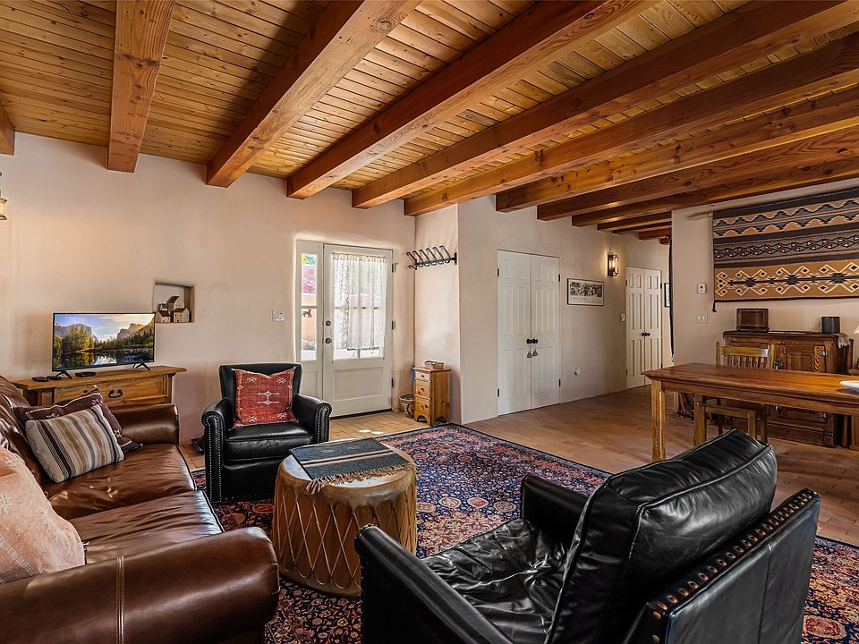 With 3 bedrooms, 2.5 baths, and 2,560 sf (including a separate studio), the home features radiant floor heating, forced-air HVAC, and air conditioning in select rooms. Thick adobe walls ensure natural comfort year-round.