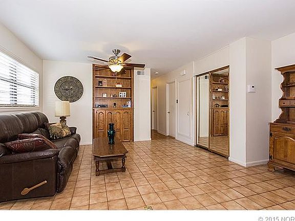 Lovely 4 bedroom bungalow with 2 large living spaces, large back porch, storm shelter, large fenced yard on corner lot. Wheelchair ramp accessible. 2014 Roof. Great view of park from back porch.